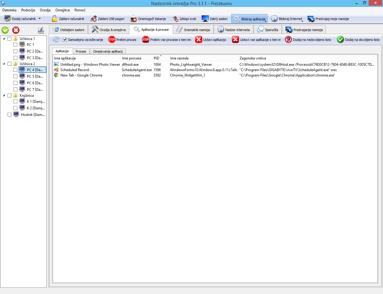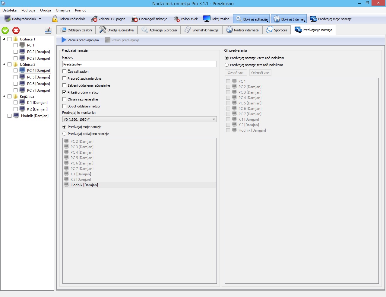 Spodnje zaslonske slike prikazujejo najpomembnejše dele vmesnika: oddaljeni zasloni, prikaz stanja, snemanje in blokade interneta.